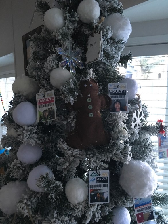 Our tree this year is full of our ski passes as usual and new this year I filled it with fuzzy, soft snowballs. They remind me so much of you. And your brothers, too. I hope it makes you smile as you look down on it. Yup, your Santa hat is still at the top as our angel.